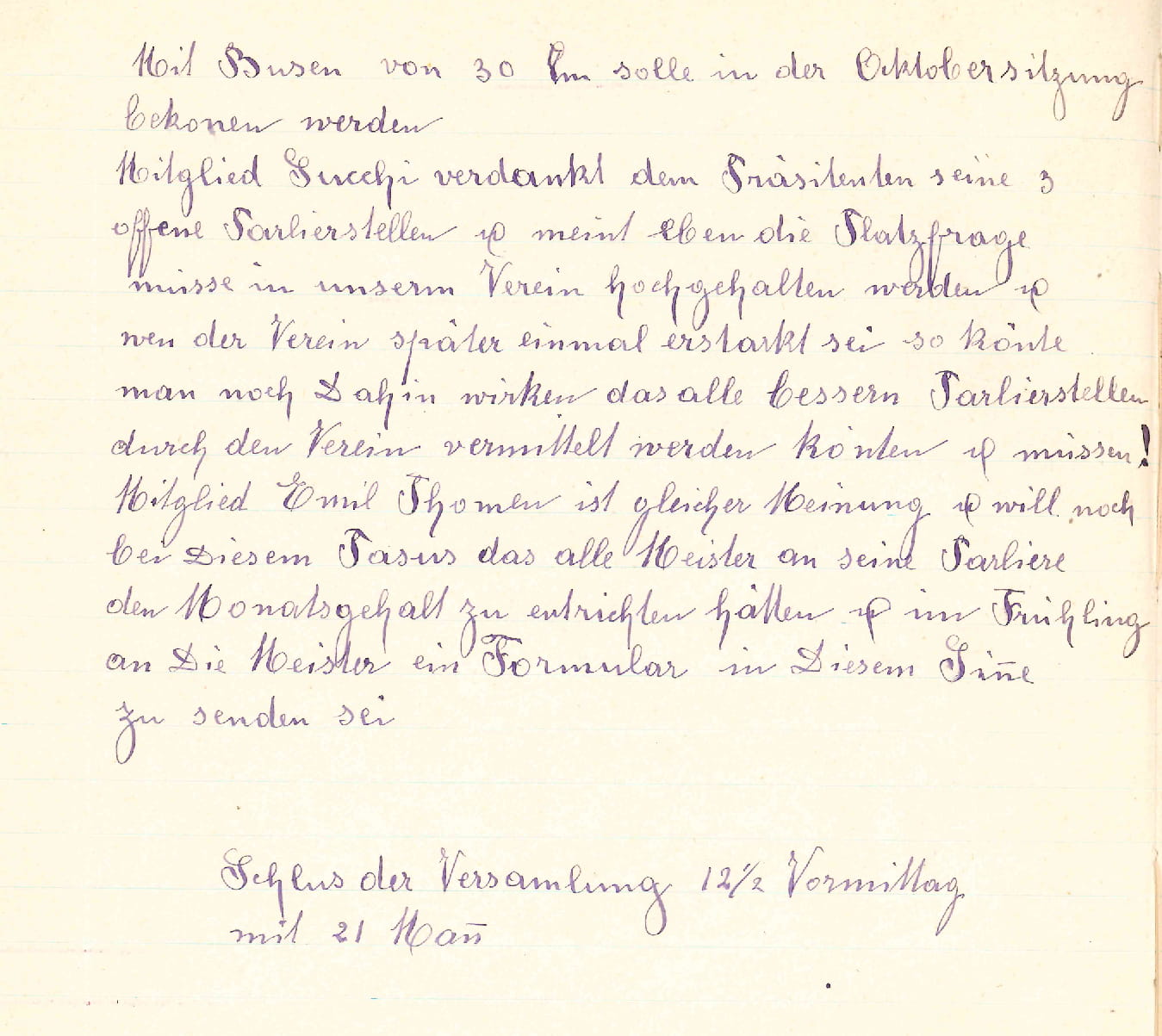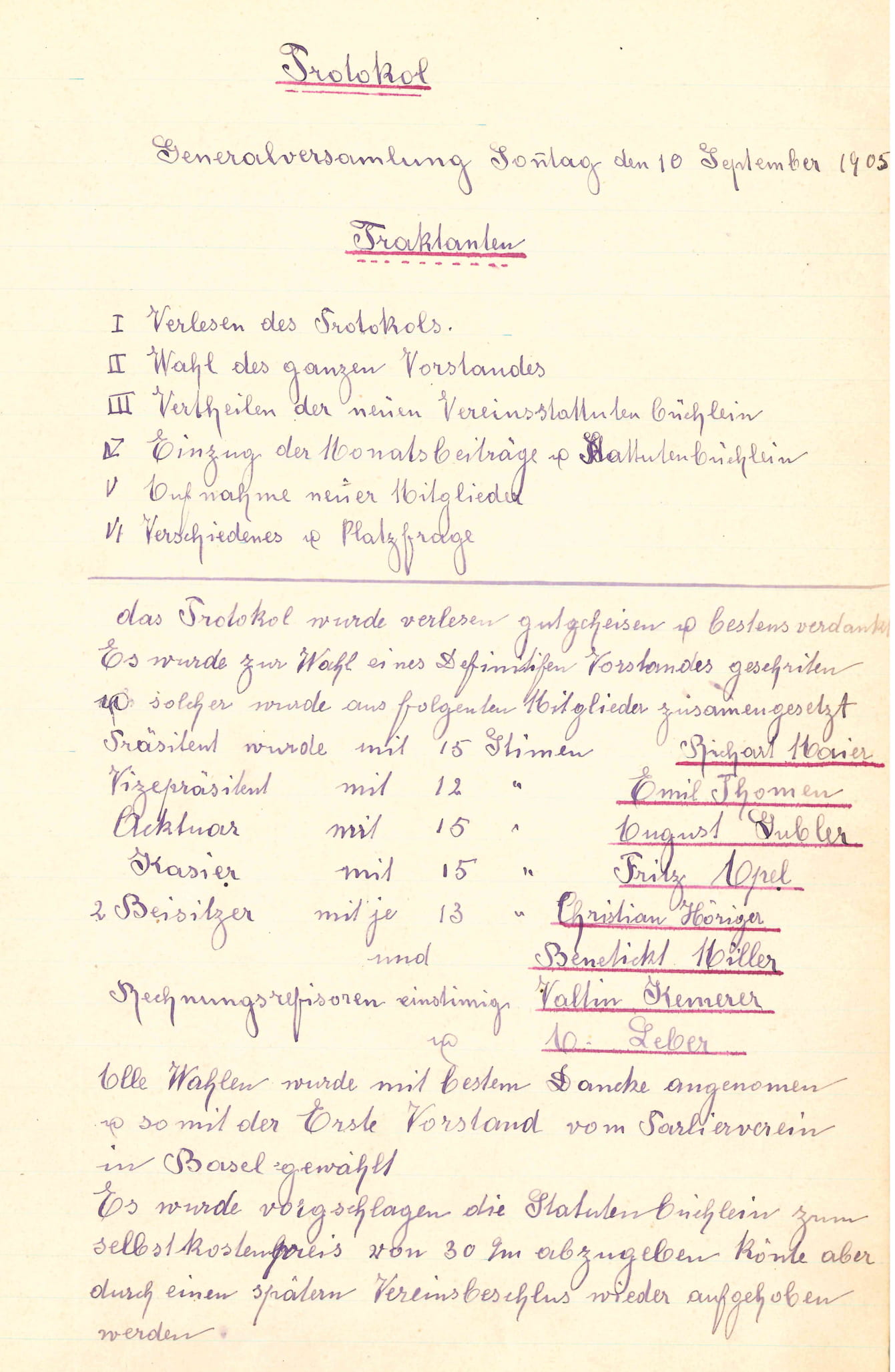 Gründungsprotokoll 10. September 1905 Parlierverein vom Baugewerbe Basel